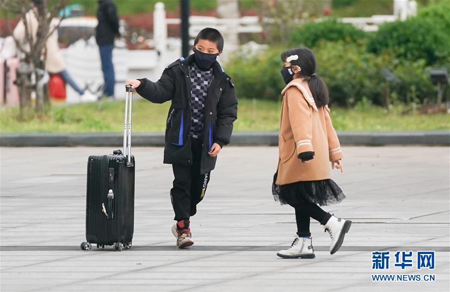 3月28日,兩名抵漢的小旅客在武漢站廣場上。新華社記者程敏攝
