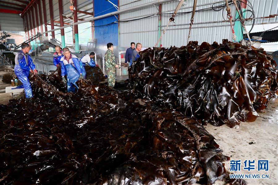 4月10日,霞浦縣長(zhǎng)春鎮(zhèn)埕塢村一家海帶加工廠內(nèi),工人在搬運(yùn)剛收獲的海帶。新華社記者姜克紅攝