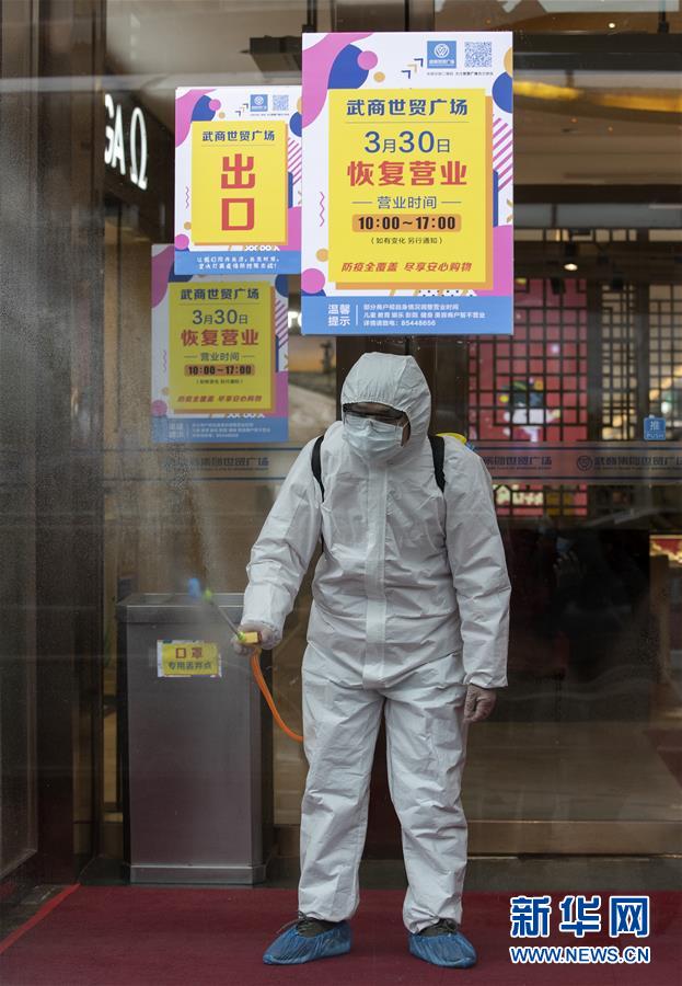 3月30日,在武商世貿(mào)廣場,工作人員在開門前進行最后的消殺工作。當日,武漢市多家商場開門迎客。新華社記者費茂華攝