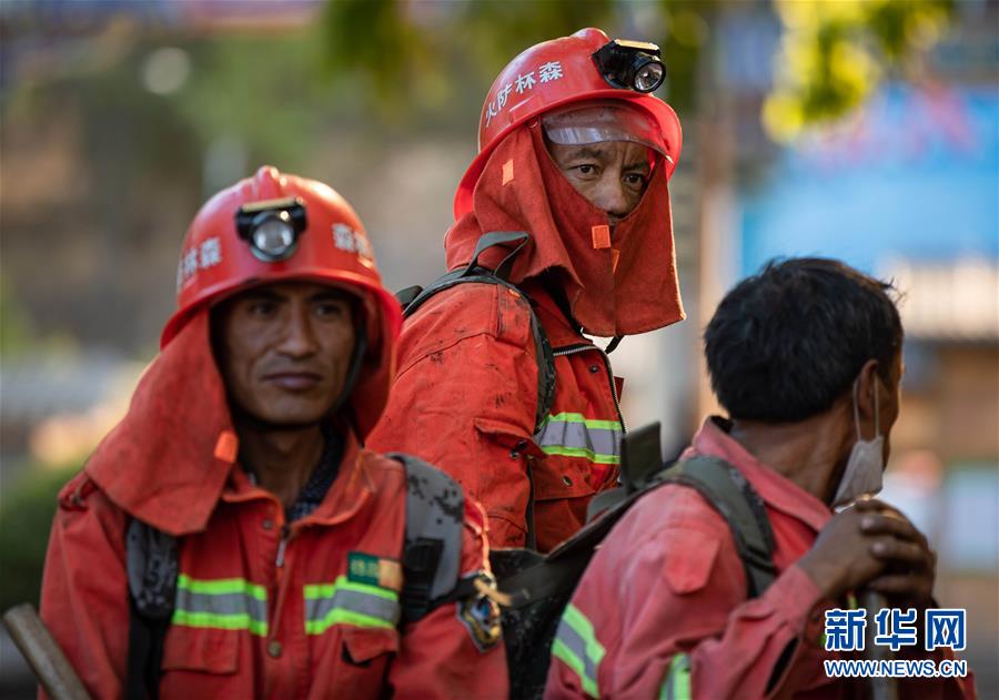 3月31日,幾名剛從火災現(xiàn)場撤下來的撲火隊員在休整。新華社記者江宏景攝