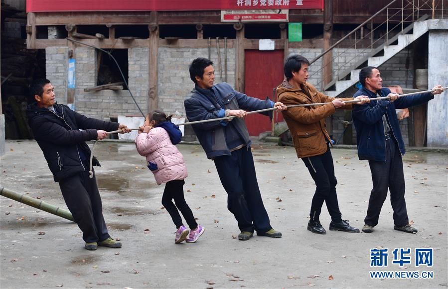 烏英苗寨村民合力抬木頭下山,準備制作蘆笙柱(12月2日攝)。新華社記者黃孝邦攝