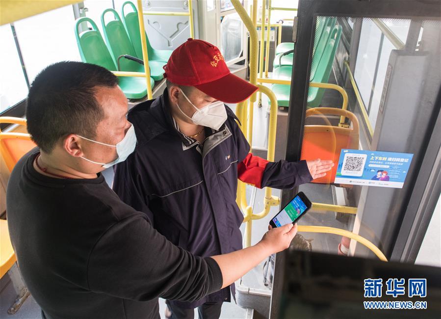 3月23日,在武昌火車站公交車總站,工作人員測(cè)試掃碼登記系統(tǒng)。新華社記者肖藝九攝