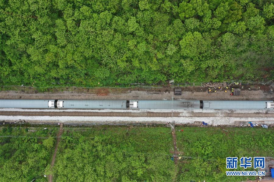 4月1日,Z201次旅客列車通過京廣鐵路郴州段脫軌事故區(qū)段(無人機照片)。新華社記者李尕攝