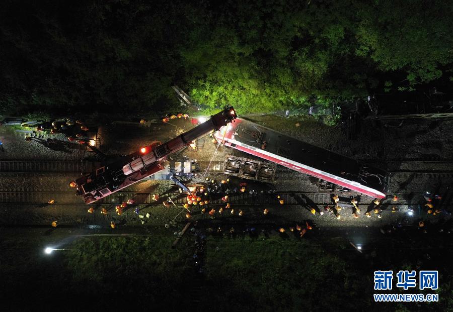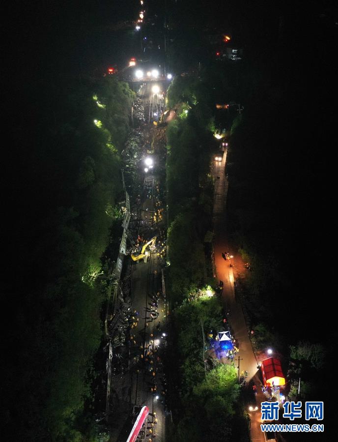 3月31日,工程車輛在T179次客運列車脫軌現場作業(yè)(無人機照片)。新華社發(fā)(陳振海攝)