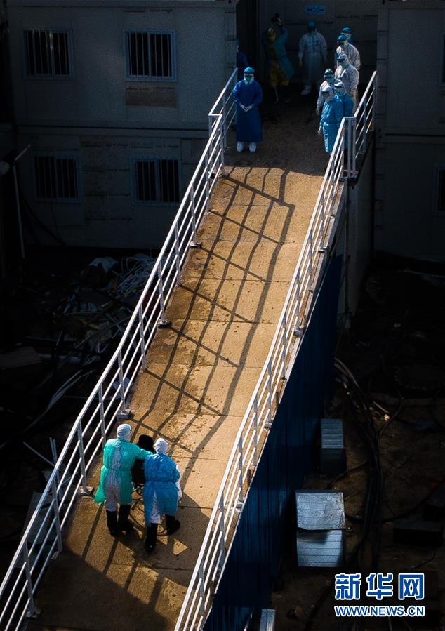 2月4日,醫(yī)護人員將患者送入武漢火神山醫(yī)院病房(無人機照片)。 新華社記者肖藝九攝