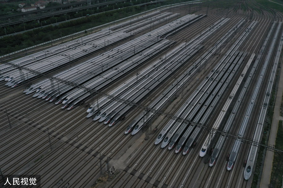 2020年4月6日,武漢動車段高鐵動車組整裝待發(fā)(無人機(jī)照片)。