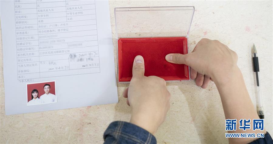 4月7日,在武漢市江岸區(qū)民政局婚姻登記處,新人辦理結(jié)婚手續(xù)時(shí)按手印。 新華社記者才揚(yáng)攝