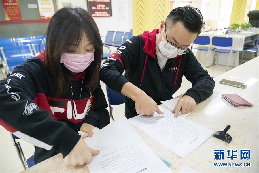 4月7日,在武漢市江岸區(qū)民政局婚姻登記處,陳先生與張女士辦理結(jié)婚登記手續(xù)時(shí)按手印。 新華社記者才揚(yáng)攝