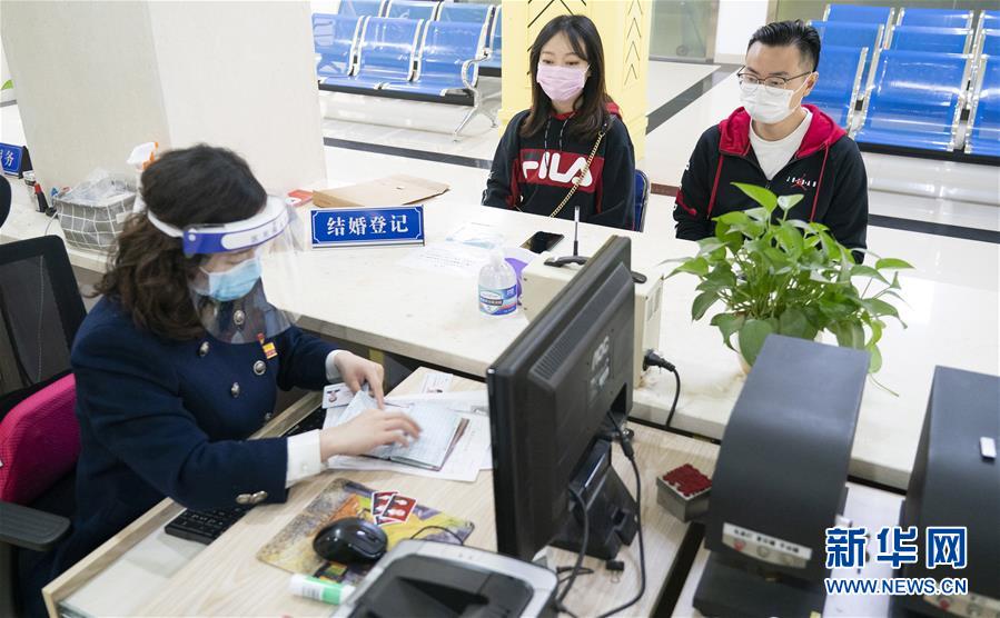 4月7日,在武漢市江岸區(qū)民政局婚姻登記處,新人陳先生與張女士辦理結(jié)婚登記手續(xù)。 新華社記者才揚(yáng)攝