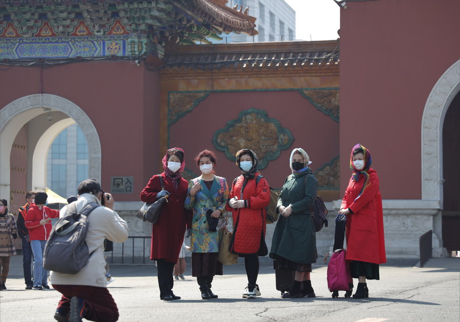 2020年4月6日,遼寧沈陽,北陵公園在清明小長假的最后一天,游客猛增。市民對各項游戲都踴躍參與。圖為穿著美美長裙的阿姨們在合影。