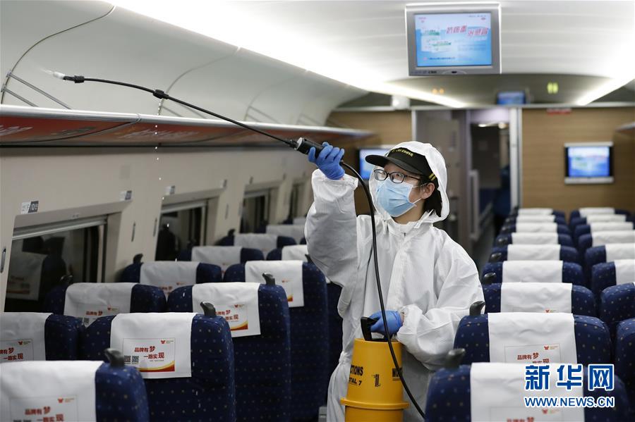 4月7日,武漢動車段運(yùn)用車間工作人員周明輝在給列車消毒。 新華社記者 沈伯韓 攝