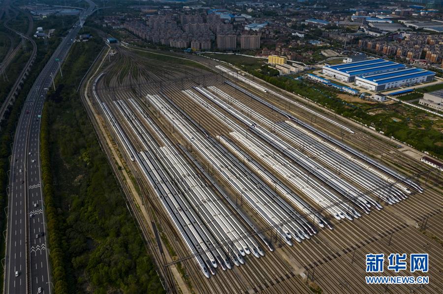 4月7日,在武漢動車段,列車停靠在存車線上(無人機(jī)照片)。 新華社記者 肖藝九 攝