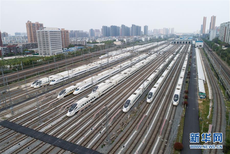 4月7日,在武漢動車段,列車??吭诖孳嚲€上(無人機照片)。 新華社記者 肖藝九 攝