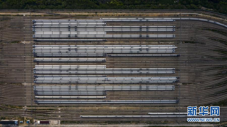 4月7日,在武漢動車段,列車??吭诖孳嚲€上(無人機照片)。新華社記者 沈伯韓 攝