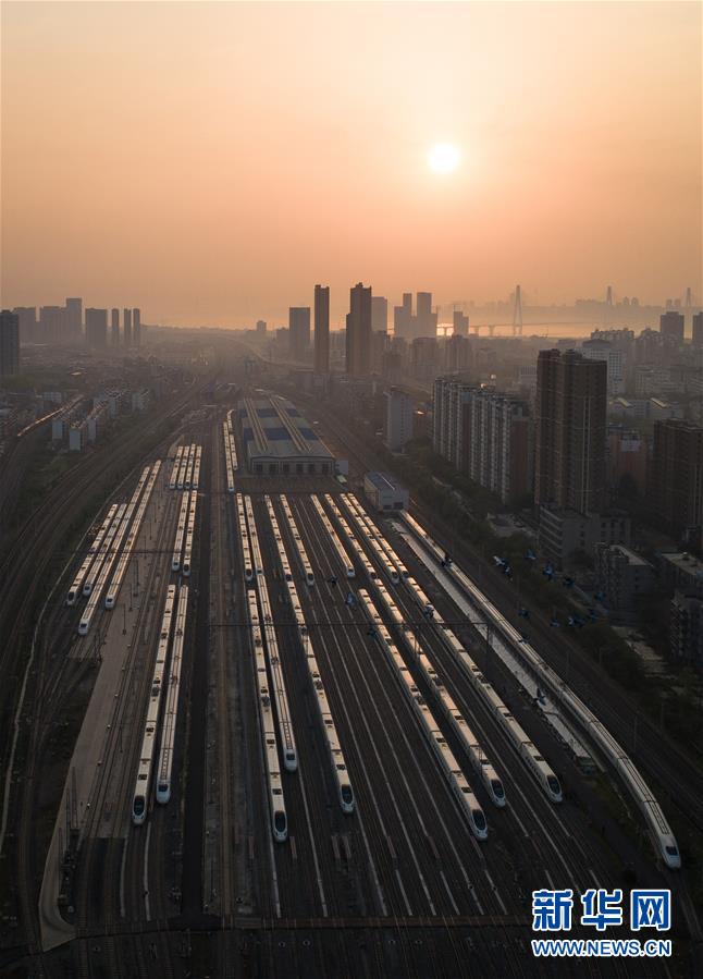 4月8日,在武漢動(dòng)車段,列車??吭诖孳嚲€上準(zhǔn)備投入運(yùn)行(無(wú)人機(jī)照片)。當(dāng)日,武漢市正式解除離漢離鄂通道管控措施,幾十組在武漢動(dòng)車段經(jīng)過(guò)檢修消殺的動(dòng)車組,猶如“陸地艦隊(duì)”??吭诖孳嚲€上,蓄勢(shì)待發(fā),重新啟程。 新華社記者 肖藝九 攝
