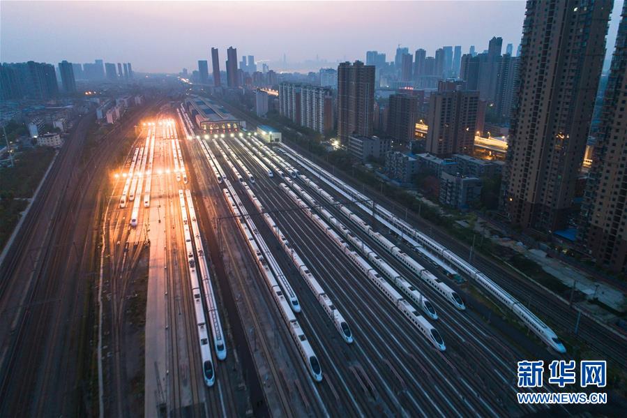 4月8日,在武漢動(dòng)車段,列車停靠在存車線上準(zhǔn)備投入運(yùn)行(無(wú)人機(jī)照片)。新華社記者肖藝九攝