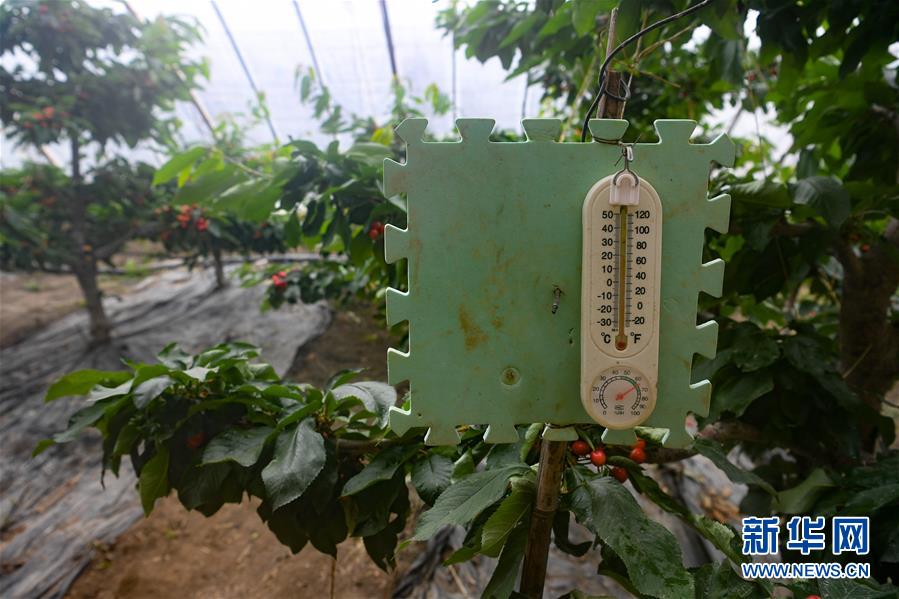 這是4月15日在特克斯礪劍鋒農(nóng)林科技有限公司赤谷新城休閑觀(guān)光農(nóng)業(yè)示范園拍攝的反季節(jié)大櫻桃大棚內(nèi)的溫濕度計(jì)。大棚采用自動(dòng)控制通風(fēng)裝置,保持棚內(nèi)溫度濕度穩(wěn)定。近日,新疆伊犁哈薩克自治州特克斯縣的反季節(jié)大櫻桃陸續(xù)上市。傳統(tǒng)大田櫻桃的集中成熟期在6月底至7月初,采用溫室大棚種植櫻桃可將成熟期提前到3月底至4月初,填補(bǔ)了市場(chǎng)空檔期。特克斯礪劍鋒農(nóng)林科技有限公司目前種植反季節(jié)大櫻桃共有19棚,櫻桃每公斤售價(jià)達(dá)200元。新華社記者宋彥樺攝