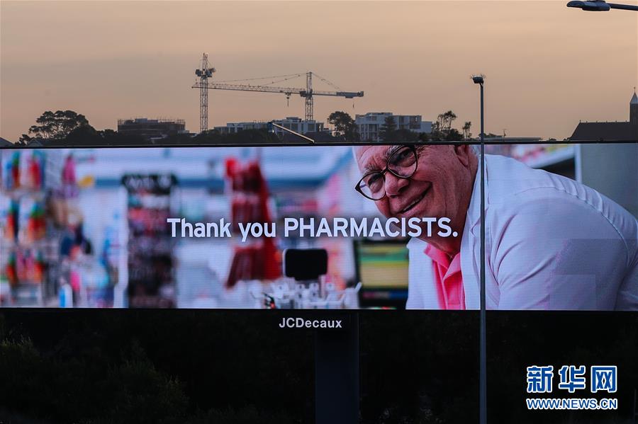 4月15日,在澳大利亞悉尼,戶外廣告牌上打出“感謝藥劑師”的字樣,感謝在疫情期間工作的人們。