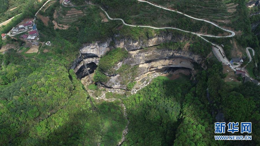 這是在陜西省漢中市寧強(qiáng)縣火石子村用無人機(jī)拍攝的地洞河天坑。新華社張博文攝