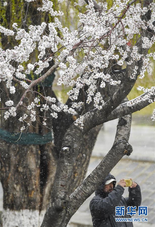 4月21日,市民在長春市杏花村公園拍攝雪景。當(dāng)日,吉林省多地迎來降雪天氣。新華社記者許暢攝