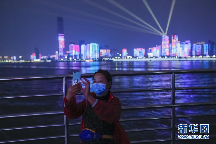 4月22日,市民乘坐武漢長江客運(yùn)輪渡出行時(shí),在船上拍攝夜景。為建立與經(jīng)濟(jì)社會(huì)發(fā)展和疫情防控需要相適應(yīng)的運(yùn)輸服務(wù)保障機(jī)制,保障市民出行需求,從4月22日起,武漢城市公共交通有序恢復(fù)全線網(wǎng)運(yùn)營。新華社記者沈伯韓攝