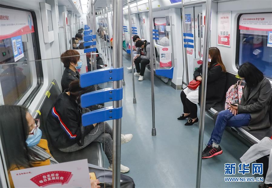 4月22日,在武漢軌道交通一號(hào)線上,乘客間隔一定距離坐在車(chē)廂里。為建立與經(jīng)濟(jì)社會(huì)發(fā)展和疫情防控需要相適應(yīng)的運(yùn)輸服務(wù)保障機(jī)制,保障市民出行需求,從4月22日起,武漢城市公共交通有序恢復(fù)全線網(wǎng)運(yùn)營(yíng)。新華社記者沈伯韓攝