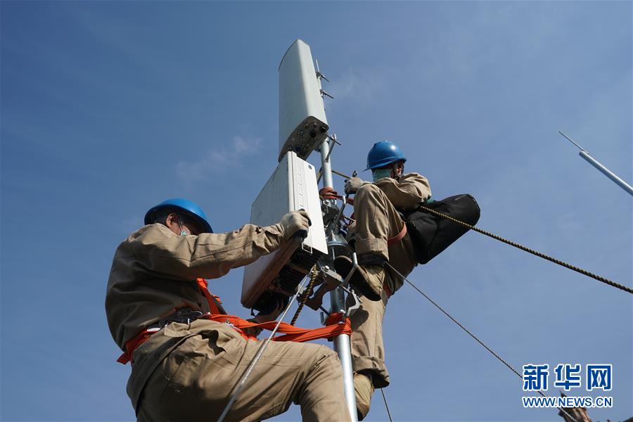 4月25日,在南京220千伏城南河變電站屋頂,工人在架設5G設備。當日,三大通信運營商的2座5G、3座4G基站建設工作在南京220千伏城南河變電站屋頂有序展開。在變電站內(nèi)建設基站可有效利用電網(wǎng)資源,縮短建設周期,節(jié)約建設成本。新華社記者季春鵬攝