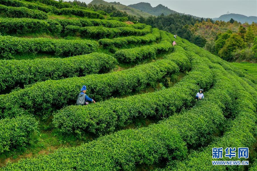 4月25日,茶農(nóng)在“扶貧茶園”內(nèi)采茶(無人機(jī)照片)。谷雨過后,在貴州省黔東南苗族侗族自治州丹寨縣“扶貧茶園”,茶農(nóng)搶抓農(nóng)時(shí)趕制春茶。丹寨縣創(chuàng)新產(chǎn)業(yè)扶貧模式,鼓勵(lì)社會(huì)公眾線上認(rèn)領(lǐng)茶園,再由茶園聘請(qǐng)當(dāng)?shù)刎毨魟?wù)工,為貧困戶創(chuàng)造茶園管理、采茶、制茶等就業(yè)機(jī)會(huì),幫助貧困戶增收。今年以來,“扶貧茶園”已接受線上預(yù)訂600余畝,給當(dāng)?shù)?00余名村民提供了就業(yè)機(jī)會(huì)。新華社記者歐東衢攝