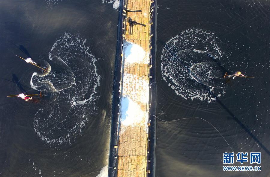 4月27日,莆田鹽場(chǎng)的工人在曬鹽池里忙碌(無人機(jī)照片)。莆田鹽場(chǎng)位于福建省莆田市秀嶼區(qū)東嶠鎮(zhèn),辛勤勞作的鹽工、縱橫交錯(cuò)的曬鹽池,共同構(gòu)成如畫的風(fēng)景。新華社記者魏培全攝