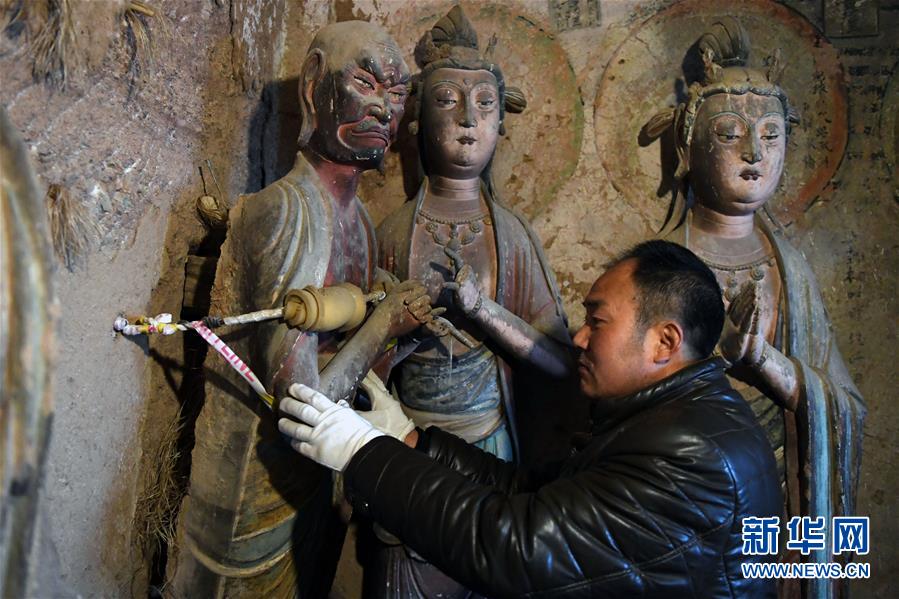 12月25日,在麥積山石窟第11窟,修復(fù)師牟常有對(duì)塑像破損處進(jìn)行加固處理。新華社記者馬寧攝
