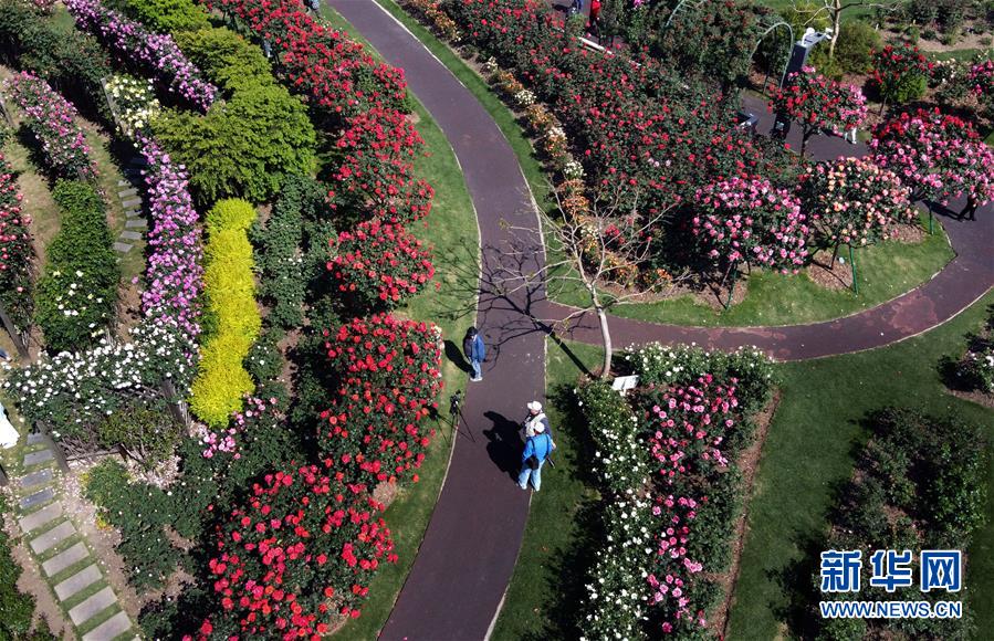 4月28日,游人在上海辰山植物園的月季島上賞花(無人機(jī)照片)。近日,上海迎來月季花期,上海辰山植物園的月季島上,各色月季競(jìng)相綻放,形成絢爛花海。新華社記者劉穎攝