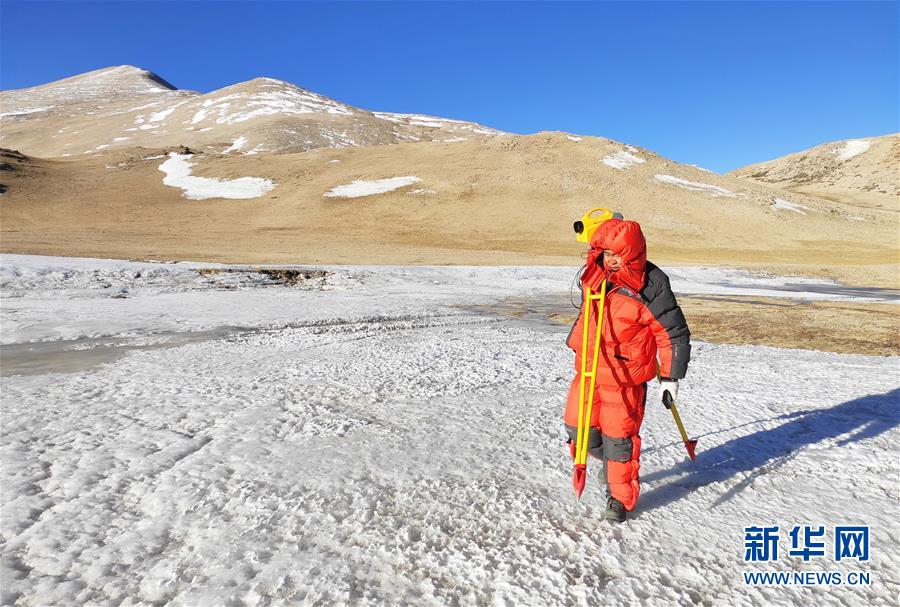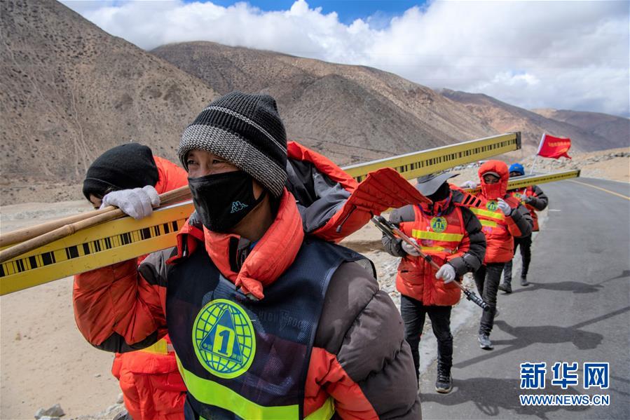 在西藏定日縣曲當鄉(xiāng)境內(nèi),國測一大隊隊員前往水準測量點(4月18日攝)。水準測量是一種利用提供水平視線的儀器(如水準儀、水準標尺),測定地面不同點之間的高差,并以此推算高度的一種方法,是經(jīng)典大地測量的重要技術(shù)之一。在目前正在進行的2020珠峰高程測量中,部分國測一大隊隊員承擔了水準測量的任務(wù)。新華社記者孫非攝
