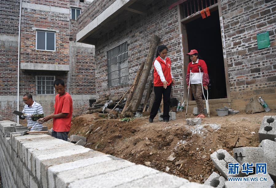 唐莉(右二)在平樂縣張家鎮(zhèn)老埠村貧困戶陶仁桂家查看無障礙設(shè)施改造項目建設(shè)進(jìn)展(5月4日攝)。新華社記者周華攝