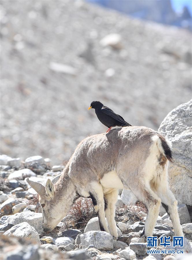 黃嘴山鴉停在巖羊背上(5月8日攝)。當日,一群巖羊在珠峰大本營周圍覓食,黃嘴山鴉飛到巖羊身上停留,構(gòu)成一幅幅生動有趣的雪域圖畫。新華社記者普布扎西攝
