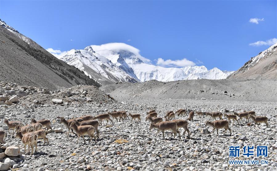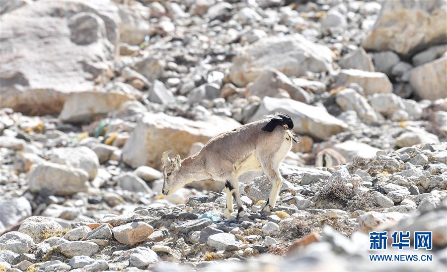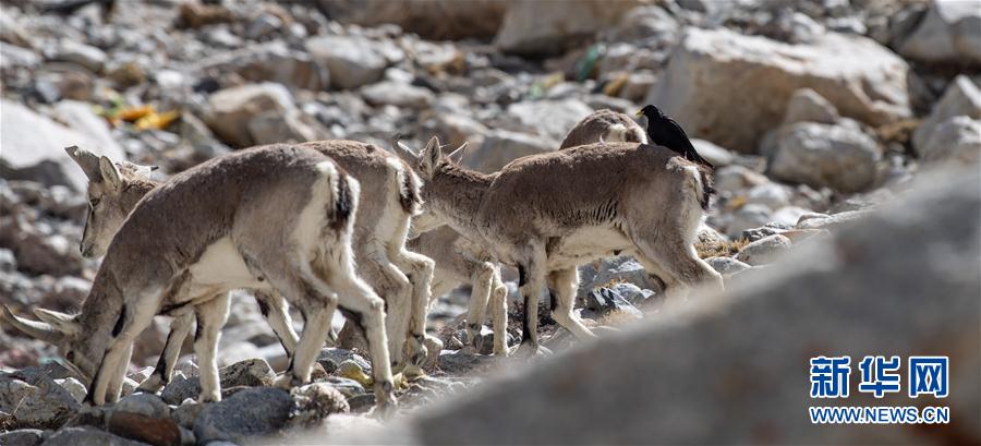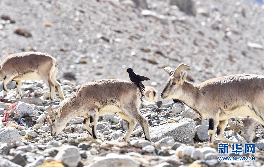 一群巖羊在珠峰大本營附近覓食(5月8日攝)。當日,一群巖羊在珠峰大本營周圍覓食,黃嘴山鴉飛到巖羊身上停留,構(gòu)成一幅幅生動有趣的雪域圖畫。新華社記者晉美多吉攝