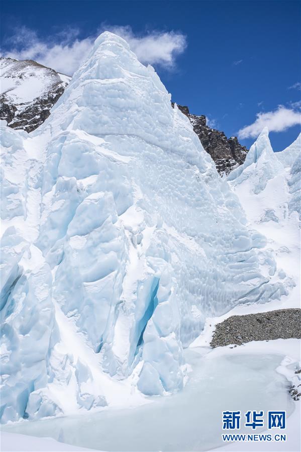 珠峰海拔5800米至海拔6500米的冰塔林(5月9日攝)。從海拔5800米的珠峰過渡營地到海拔6500米的前進營地,冰塔林沿山谷排列,蔚為壯觀。新華社記者孫非攝