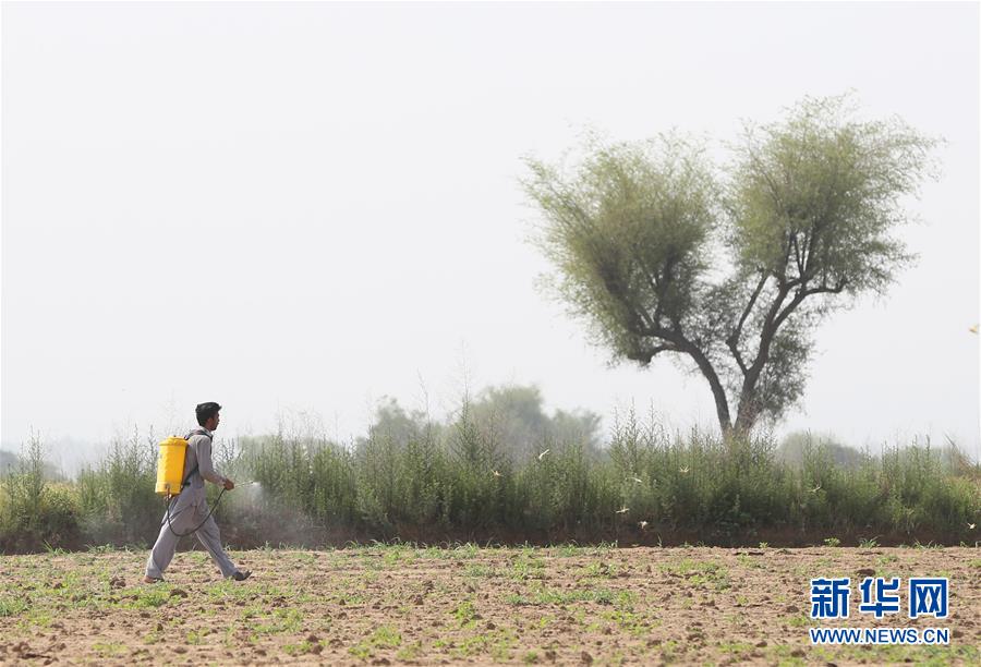 5月9日,在巴基斯坦旁遮普省杰格瓦爾地區(qū),一名工作人員在田間噴灑滅蟲劑。據(jù)巴基斯坦媒體報道,該國旁遮普省和信德省一些地區(qū)近期再次遭遇沙漠蝗蟲侵襲,當?shù)卣呀M織民眾進行緊急消殺。新華社記者 劉天 攝