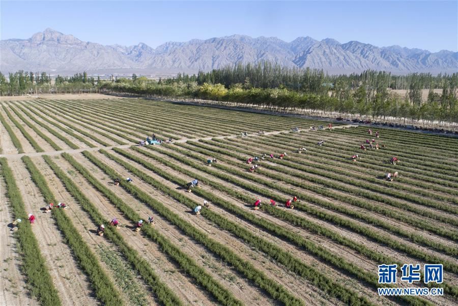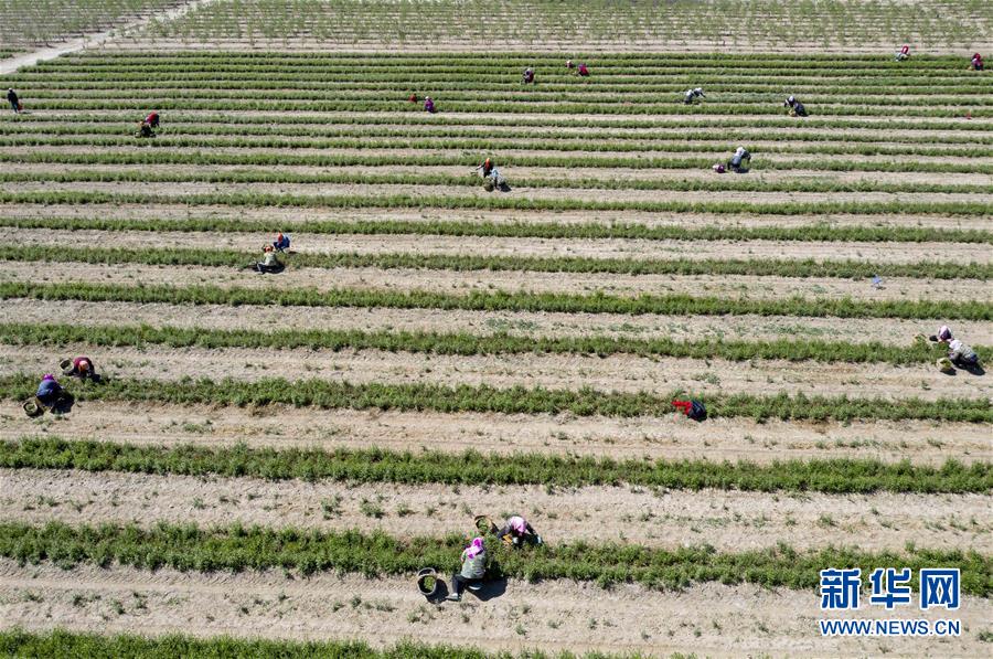 5月11日,采茶工在寧夏百瑞源賀蘭山基地采摘枸杞芽茶(無人機照片)。當日,寧夏百瑞源賀蘭山基地枸杞芽茶全面進入采摘季。據(jù)了解,該基地茶園面積300余畝,助力附近200多名農民就業(yè)增收。新華社記者楊植森攝