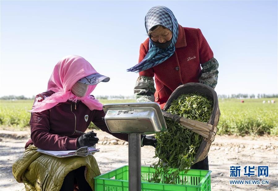 5月11日,在寧夏百瑞源賀蘭山基地,工作人員對采摘的枸杞芽茶進行稱重。當日,寧夏百瑞源賀蘭山基地枸杞芽茶全面進入采摘季。據(jù)了解,該基地茶園面積300余畝,助力附近200多名農民就業(yè)增收。新華社記者楊植森攝