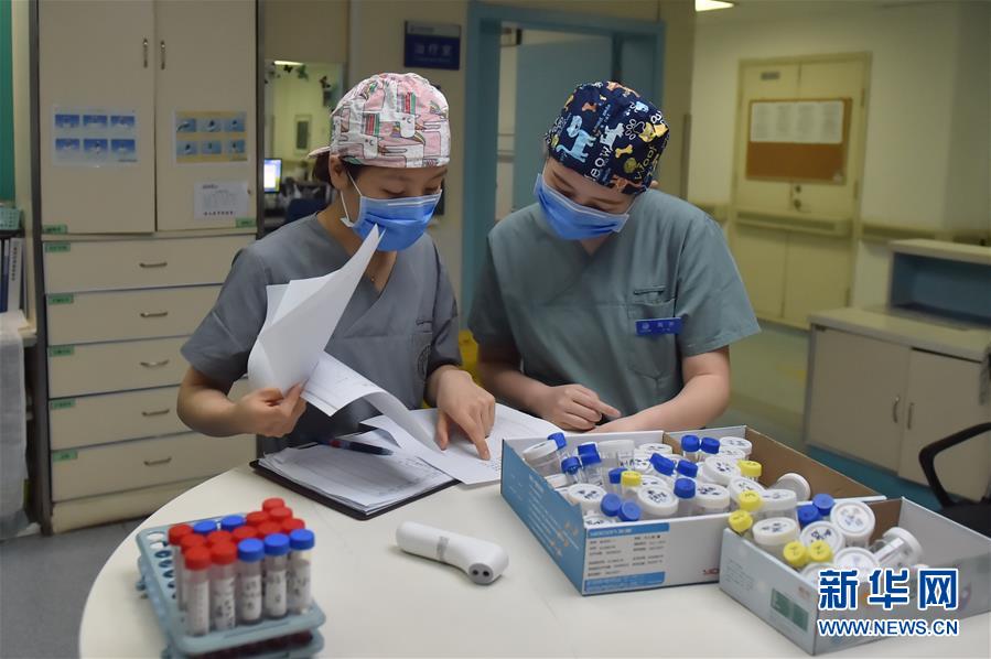 5月11日,在北京地壇醫(yī)院感染二科護(hù)士站,護(hù)士王蕊(左)和石淼在整理病人的核酸樣本。北京地壇醫(yī)院是北京市收治新冠肺炎患者的定點(diǎn)醫(yī)院之一,醫(yī)院的醫(yī)護(hù)人員一直奮戰(zhàn)在抗擊疫情的一線。在國(guó)際護(hù)士節(jié)前夕,記者前往北京地壇醫(yī)院,記錄下抗疫一線護(hù)士的日常工作狀態(tài)。新華社記者彭子洋攝