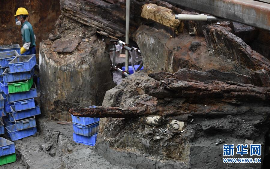 在廣東陽江海陵島,工作人員在“南海I號”發(fā)掘現(xiàn)場進行清理工作(5月12日攝)。新華社記者鄧華攝