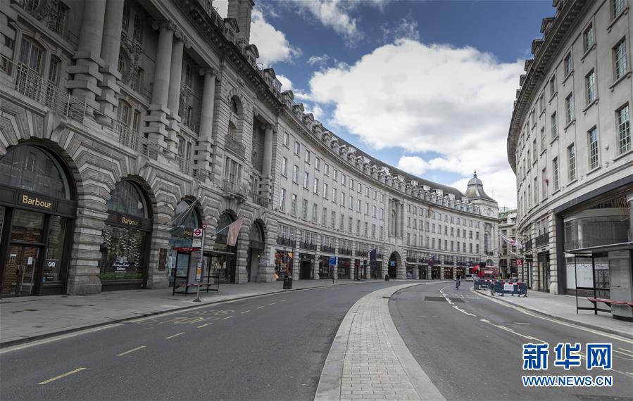 5月12日,英國倫敦主要商業(yè)街之一的攝政街上的店鋪全部關(guān)閉。新華社記者韓巖攝