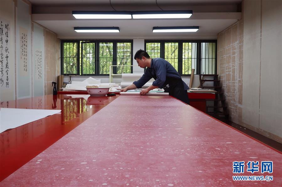 5月13日,古籍修復(fù)師在對書畫作品進(jìn)行裝裱操作。天一閣藏品修復(fù)部目前有修復(fù)師14人,每年約修復(fù)古籍14000余頁。據(jù)介紹,修復(fù)一冊古籍通常需要1至2個月,有的甚至需要1年以上。新華社記者鄭夢雨攝