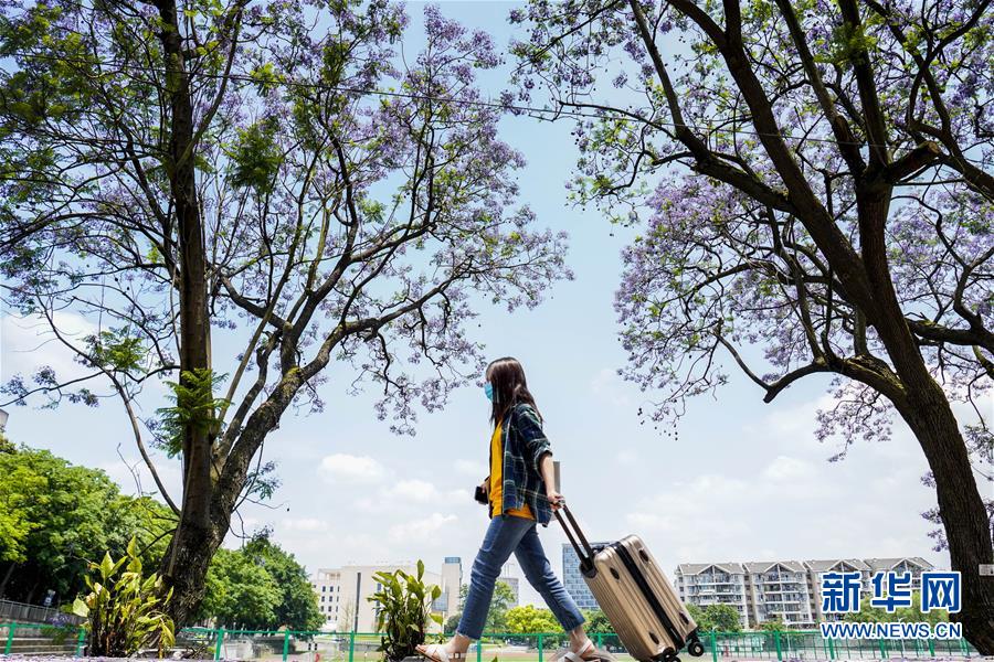 5月15日,西南大學(xué)校園內(nèi)的藍(lán)花楹樹下,一名學(xué)生拖著行李箱向宿舍走去。當(dāng)日,重慶西南大學(xué)迎來疫情以來首批返校大學(xué)生。據(jù)介紹,按照疫情防控的需要,重慶市高校2020年春季學(xué)期從5月11日起按照“一校一策”原則,實(shí)行錯(cuò)峰錯(cuò)時(shí)分批次有序開學(xué)復(fù)課。新華社記者劉潺攝