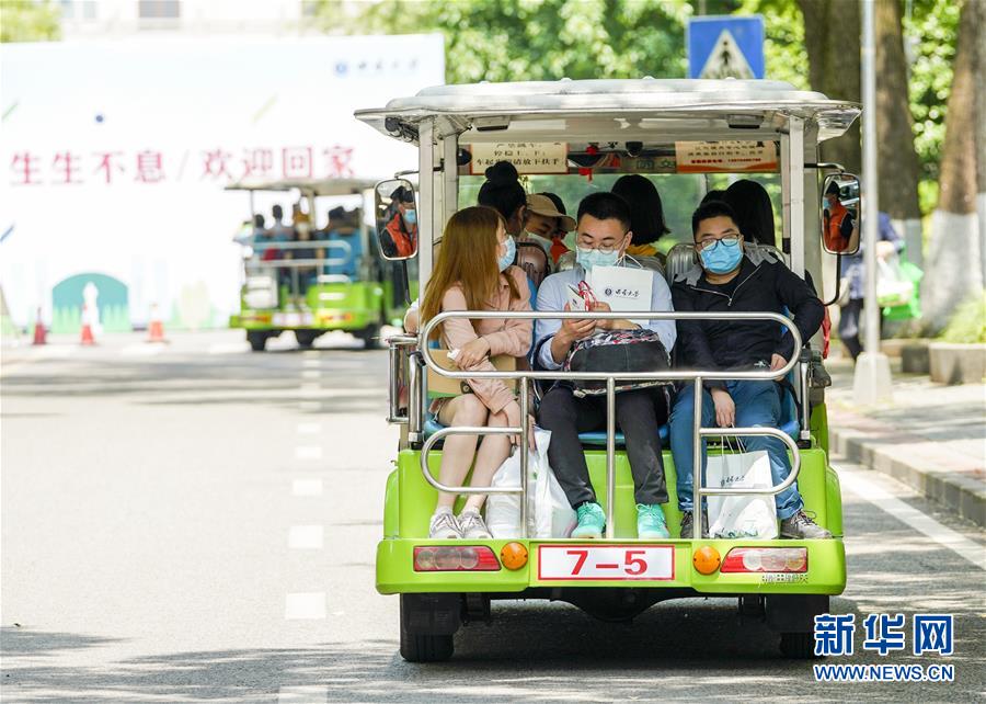 5月15日,在西南大學(xué)校園內(nèi),學(xué)生們搭乘校內(nèi)轉(zhuǎn)運車前往各自的宿舍。當(dāng)日,重慶西南大學(xué)迎來疫情以來首批返校大學(xué)生。據(jù)介紹,按照疫情防控的需要,重慶市高校2020年春季學(xué)期從5月11日起按照“一校一策”原則,實行錯峰錯時分批次有序開學(xué)復(fù)課。新華社記者劉潺攝