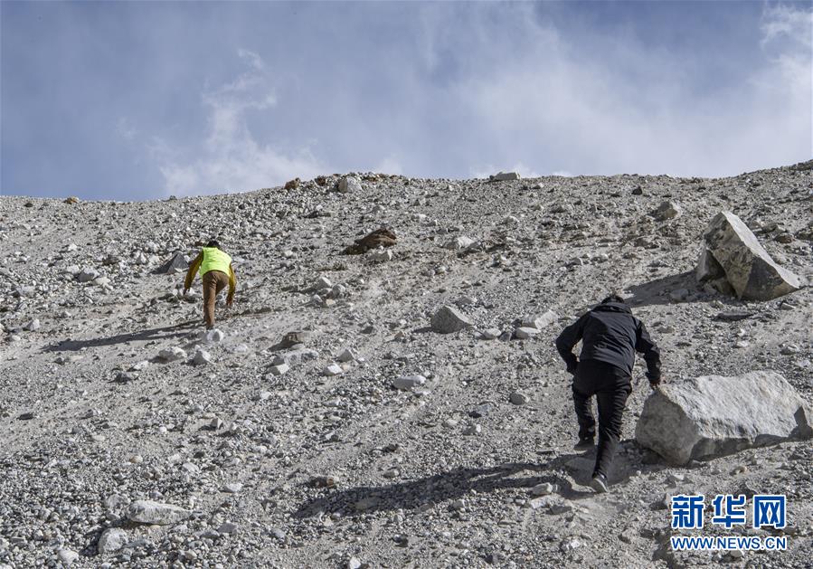 巡邏路上遇到車走不了的地方,拉巴次仁和同事就徒步攀爬,進(jìn)行巡邏(5月15日攝)。新華社記者孫非攝