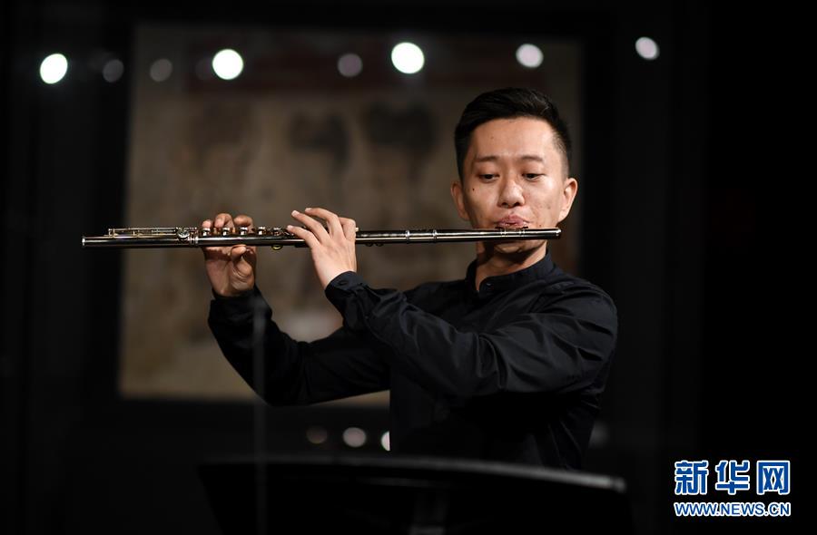 在陜西歷史博物館唐代壁畫珍品館,西安交響樂團(tuán)長(zhǎng)笛首席孫丁為“云上國寶”音樂會(huì)彩排(5月14日攝)。為迎接國際博物館日,5月14日,西安交響樂團(tuán)走進(jìn)陜西歷史博物館唐代壁畫珍品館,為5月18日的“云上國寶”音樂會(huì)彩排。觀眾將通過網(wǎng)絡(luò)直播,在聆聽天籟的同時(shí)欣賞國之瑰寶,感受藝術(shù)與美的和諧共鳴。新華社記者李一博攝
