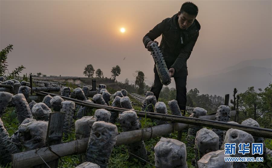 農(nóng)戶王九才在木耳種植基地整理木耳菌包(3月27日攝)。新華社記者江文耀攝