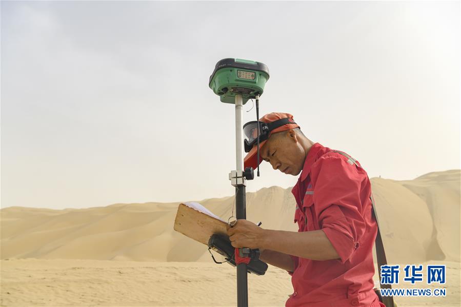 在新疆尉犁至且末沙漠公路施工現(xiàn)場,測繪員劉耀軍在沙山旁測量并標注施工線(5月17日攝)。新華社記者胡虎虎攝