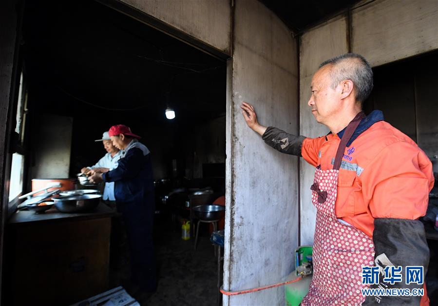 營地廚師楊云明在一旁看工友們?nèi)〔停?月16日攝)。因為營地僅有一個廚師,來自四川的楊云明自開工以來一直工作生活在營地里。新華社記者宋彥樺攝